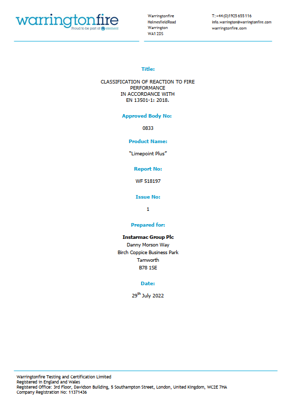 Reaction to Fire Performance Certificate - Limepoint Plus